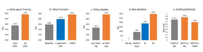 关键部分的控制变量实验:a)用 Elo(带有 CSPL 和不带有 CSPL)比较训练方法;b)使用 Elo 比较值函数的不同组成;c)使用 Elo 比较策略更新方法;d)内置机器人、使用人类游戏数据进行有监督学习的智能体和最终的强化学习智能体的 Elo 分数;e)在使用不同的选择方法时,比较平均获胜概率(RD:随机选择英雄,HWR:挑选获胜概率最大的英雄,MCTS:使用中高段位中的征召模式选择英雄。)