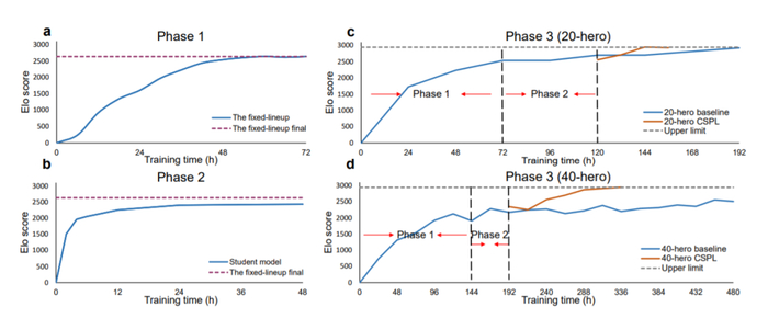 图 3:训练过程:a)教师模型的训练,即 CSPL 的第一阶段。b)蒸馏(distillation)过程中的 Elo 变化,即 CSPL 的第二阶段,学生模型的收敛 Elo 略低于教师模型。c)和 d)分别针对 20 个英雄和 40 个英雄的情况,将 CSPL 的 Elo 变化与基线方法进行比较。注意基线方法中没有第一阶段和第二阶段。CSPL 在扩展英雄池时具有比基线方法更好的扩展性。