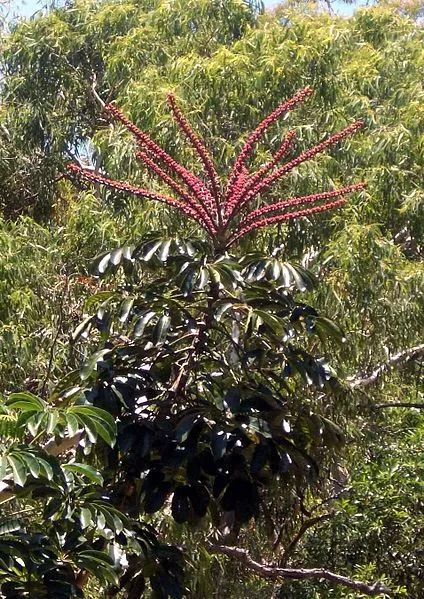 辐叶鹅掌柴像烟花一样的深红色花序。图片:John Hill / wikimedia