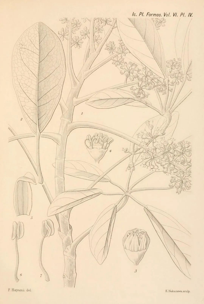 有意思的是,早田文藏发表鹅掌藤的时候还出现了一点疏忽。他似乎曾想过用佐佐木的姓来给这个新种取名,在墨线图的图注中,早田文藏使用的种加词是“sasakii”;但在正文的描述里,这个种加词又变成了“arboricolum”。后人当然要以正文里用的为准啦,只能让佐佐木委屈一下了。