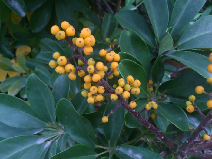 鹅掌藤不经常开花,花后会结出橙色的果实。图片:含笑