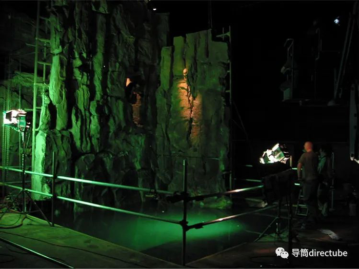 这一场景也提前用缩小比例的模型做出来,随后在松林制片厂Pinewood Studios中也搭建出了一个50英尺x50英尺的水池用于拍摄实景,此处的灯光主要为黄色照明棒提供。