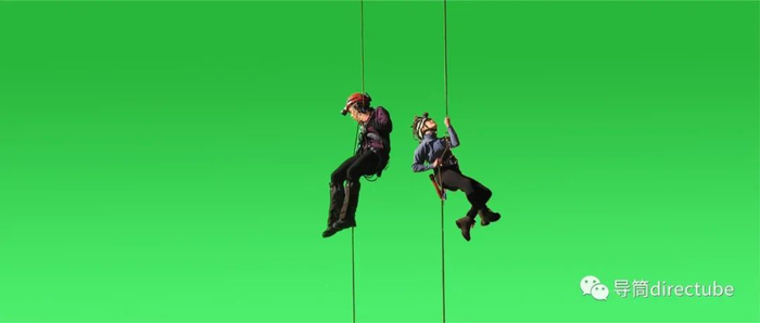 片中的女演员从洞穴入口下降的这一场戏是在绿幕中拍摄的,看起来是沿着绳索缓缓下降,但实际拍摄上她们的位置根本并没有发生任何移动。这个镜头在特效合成时被添加到带有数字模型的背景版中做成了下降的状态。