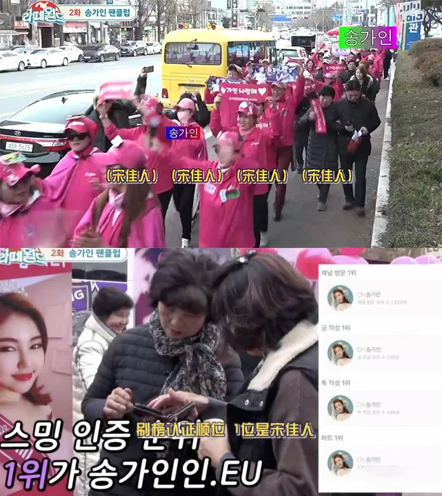 目前,韩国的顶流Trot歌手是34岁的宋佳人,有不少媒体称她为"韩国演歌界的防弹少年团"。这个称呼并不夸张,在韩国Idol Chart榜单中,宋佳人在一众大火的男团爱豆里排名第八,是唯一入围前十女明星。喜爱她的中老年人们还组成了秩序井然的粉丝组织,为其应援,甚至刷榜。