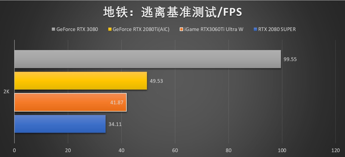 在《地铁:逃离》基准测试中,同平台下 iGame RTX 3060 Ti Ultra W 2K 场景下平均帧率为 41.87 帧;而非公版的 RTX 2080 Ti 在 2K 场景下跑分为 49.53 帧,RTX 2080 SUPER 在 2K 场景下跑分为 34.11 帧。