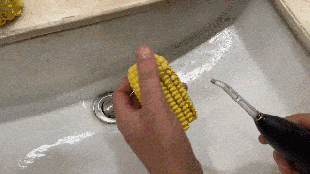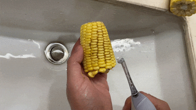 为此,我们准备了三根玉米,打湿表面后涂抹上孜然粉,然后再利用三款冲牙器分别进行冲刷测试。