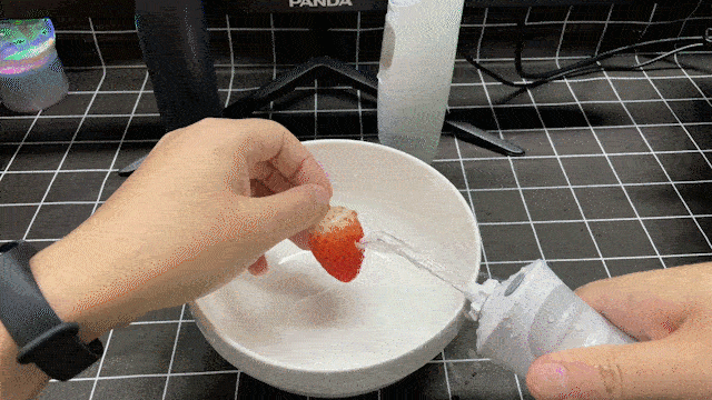 我们先用草莓作为冲刷对象,三款产品分别冲刷草莓表面3秒左右,观察记录草莓的瞬间变化情况。