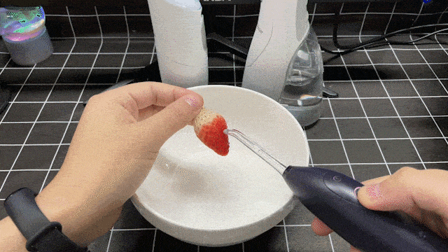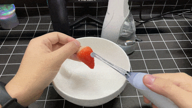 第二个则是飞利浦HX8340,在三连喷模式下,仅仅两次之后草莓就被冲击出孔洞。