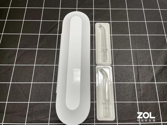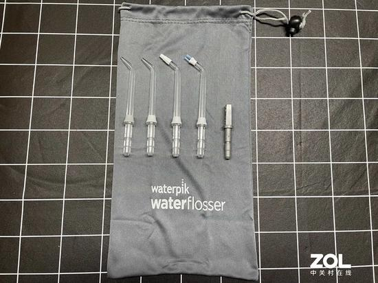 洁碧GS8-1提供了两个标准喷头、一个正畸喷头、一个牙菌斑喷头和一个防水防尘塞,并且还配备了一个收纳袋。