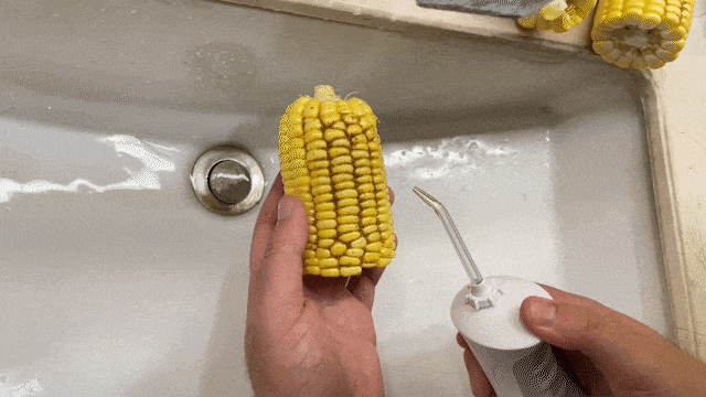 通过图片我们可以看到,三款冲牙器的表现都是不错的,能达到一个较好的清洁效果,玉米的缝隙之间的孜然粉都全部冲洗干净了。