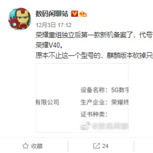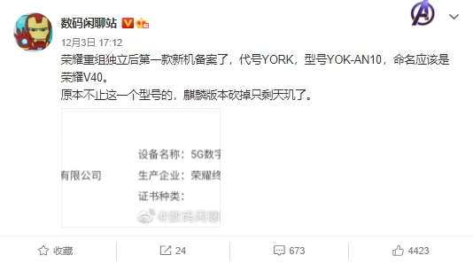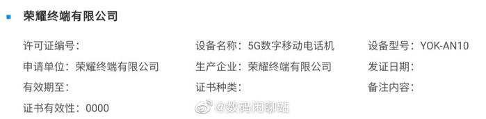 数码博主 @数码闲聊站 表示,荣耀自华为独立后的第一款新机现已备案,该机代号为 “YORK”,型号为 “YOK-AN10”,命名预计为荣耀 V40 的,将搭载联发科天玑系列 5G 芯片。