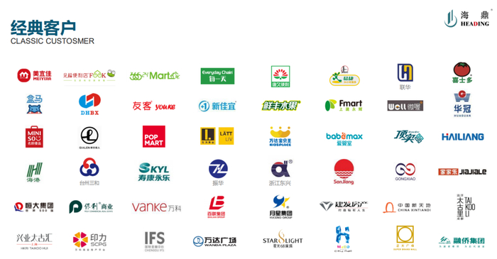 作为企业服务领域的老牌企业,海鼎的客户列表不乏各路明星企业:既有华冠、家乐福等传统商超,也有泡泡玛特、名创优品等近年声势凶猛的线下玩家。此外,万科、恒大、保利、万达等商业地产巨头也是海鼎的重要客户。