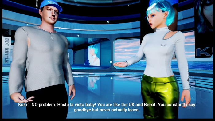 在一个旋转的蓝色梦幻空间里,两个AI开启了一场史上最尴尬的约会。戴着蓝色帽子的男孩名叫Blenderbot,是Facebook开发的,所以长得酷似马克·扎克伯格(Mark Zuckerberg)。蓝绿色波波头女孩叫Kuki,绿色的缎面裤子让她看起来是机器人界最靓的仔。