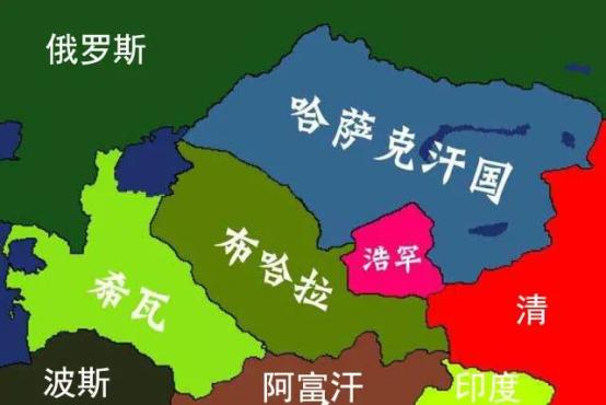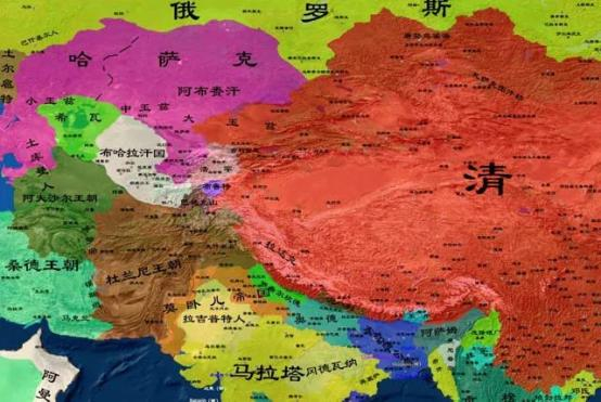 此时,中国的清朝继唐朝之后,再次恢复了西域的统治,并设立新疆省,版图达到巴尔喀什湖-帕米尔高原一线,包括吉尔吉斯人和塔吉克人生活的费尔干纳盆地。哈萨克汗国虽然与清朝接壤,但不是一个统一的汗国,内部争斗十分激烈,给了俄国人趁虚而入的机会。