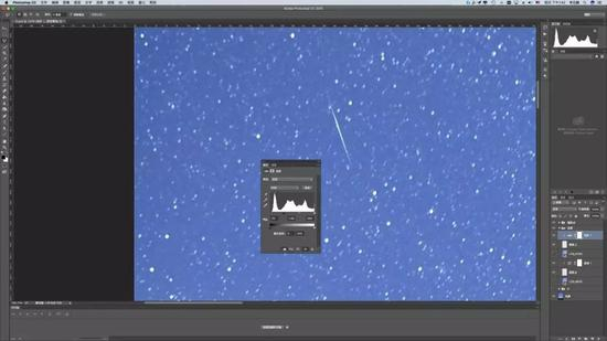 除了曲线调整外,还可以使用色阶工具,将左端黑色滑块向右移动到流星的背景星空消失即可。