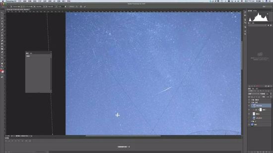 如下图为 1 小时流星浅色对齐叠加,去除掉飞机、卫星等影响,剩下的有同一个辐射点的就是流星了,后期只需要把这些流星抠出来即可。如果没有赤道仪,就需要经手动对齐星空,前期拍摄隔一段时间就要停下来移动天区。