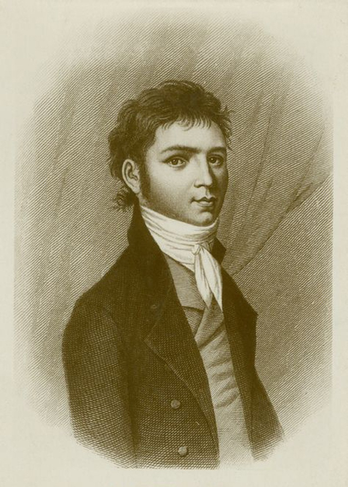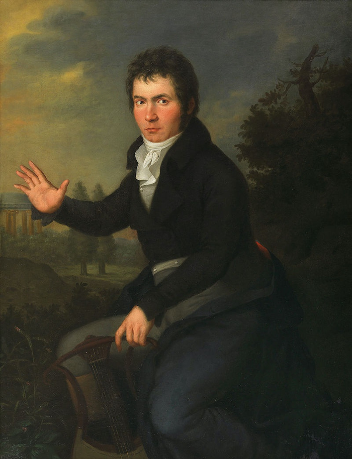 梅勒于1804年为贝多芬绘制的肖像。他的左手拿着象征阿波罗的里拉琴,画面背景是阿波罗神庙和一片阴暗的森林。