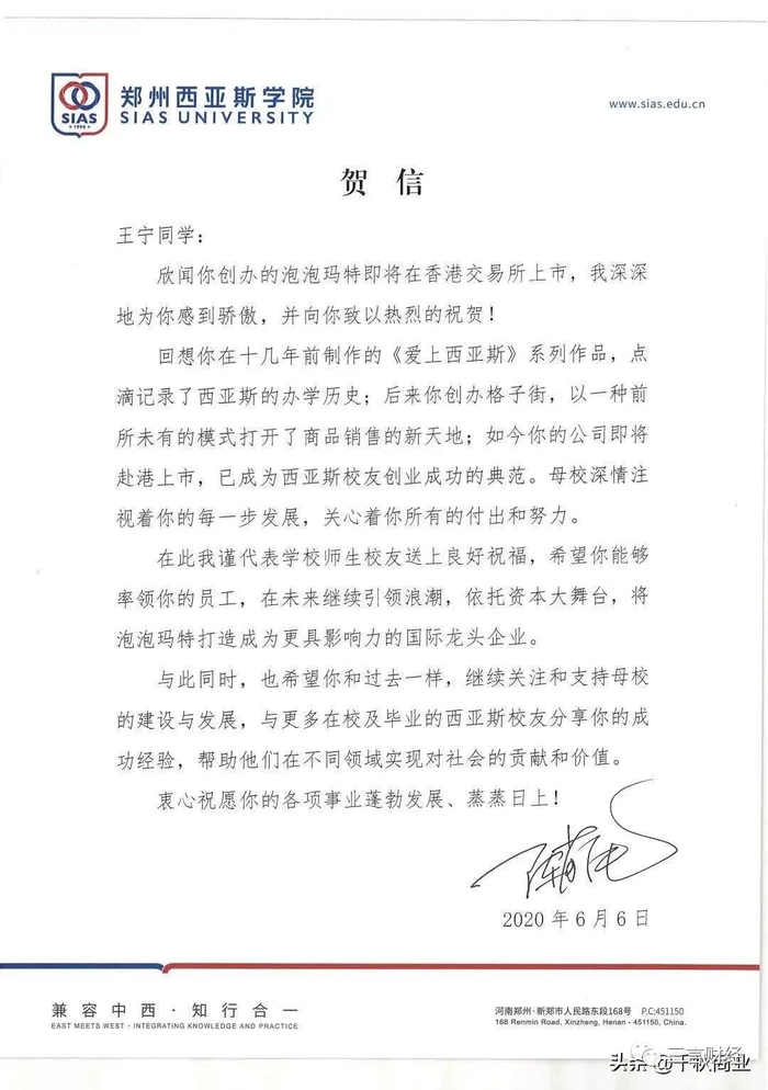 郑州西亚斯学院在贺信中首先就泡泡玛特即将在港交所上市做出祝贺,并为王宁感到骄傲。此外,贺信中也提及了王宁曾经在校学习时的一些成功经历。