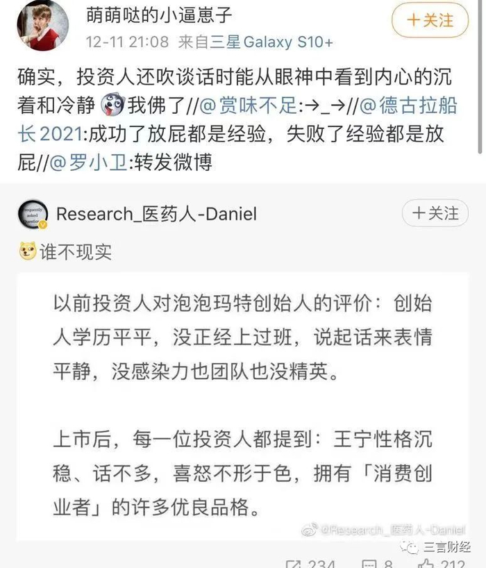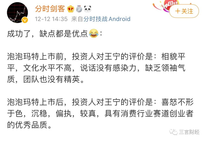 根据这篇报道,在泡泡玛特上市前,凡是同意给泡泡玛特投资的投资人均对王宁做出正面评价;但选择不投资的投资方则都表示不看好。