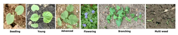 喷洒作业并不会涉及到非常复杂的流程,喷雾器的机械设计也很直观,但要实现智能喷洒,在实践过程中也有不少挑战需要解决。第一个挑战就是足够的农业知识——要进行杂草防治,首先需要对常见的农作物和杂草有一定的了解。从下图中可以看出,随着杂草开花并分支,其形态与幼苗时期的样子已经有了很大不同,而这还仅仅只是一种杂草。目前在欧洲范围内大概就有 30,000 种杂草 [1],更遑论全世界范围内了。许多杂草或与农作物的形态相似,或只在特定领域生长(比如美国的玉米农场就会生长一种在欧洲的玉米农田里见不到的杂草)。而十年前本地常见的杂草又和现在常见的杂草不一样。要收集高质量——覆盖范围广、有代表性、标注准确等——的数据,研发人员必须具有足够的专业知识或与农学家密切合作。
