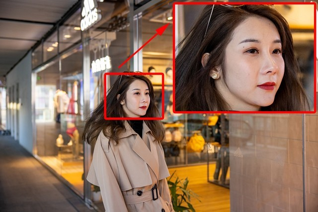 在第二组对比中,我们发现还是同样的问题,佳能EOS R5的色彩还原非常准确,而索尼A7R4的照片依旧偏黄,同时还有些许的偏绿,造成后面商铺的红色墙面有颜色的改变。另外,由于是在12月份的北京三里屯拍摄,天气寒冷,佳能EOS R5也准确的还原了模特被冻红的脸部肤色,而在索尼A7R4的照片中就很难看出来。