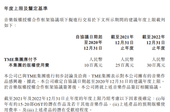根据公司公告,腾讯音乐集团自协议日起到今年结束应付公司1000万版权使用费(16天时间),明年2500万,后年3000万。