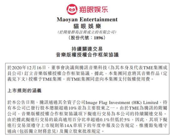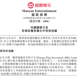 猫眼娱乐12月16日发布公告,将与腾讯音乐娱乐集团(TME集团)订立音乐版权授权合作框架协议,将向TME集团授权其拥有版权及相关权利的影视音乐作品等音乐版权,TME集团将向猫眼支付版权使用费。基于此项合作,双方将共同开拓影视音乐产业。