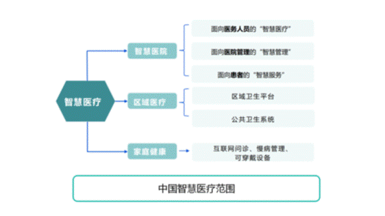 在本文中,我们界定的智慧医疗范围包括三大类,如下图所示: