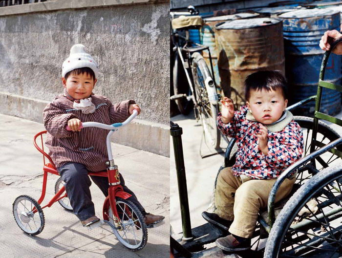 △ 北京,1980年,有一辆新玩具三轮车的小男孩。他的父母可能是存了很长时间的钱给他买了新三轮车。(图左)