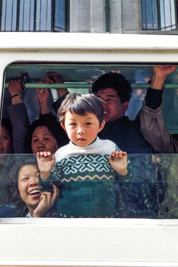 △ 上海,1980年3月,一个小男孩在公共汽车上被照相机吸引了。他的母亲在后面微笑。多么亲密的关系!