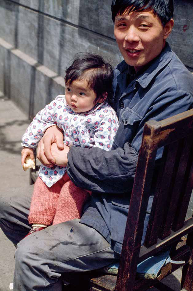 上海,1980年3月,小女孩紧紧地抓着她的父亲,她肩上背着一个时髦的包。(图右)