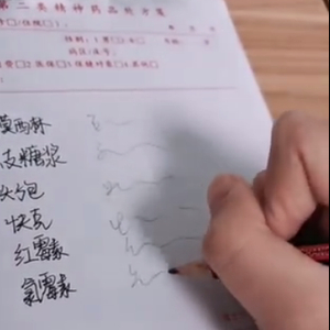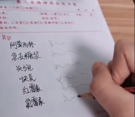 这段8秒的小视频中,罗列了阿莫西林、急支糖浆、头孢、快克、红霉素、氯霉素六种药品,而对应的处方笔迹很简单:首字偏旁+波浪线。