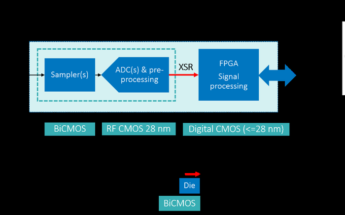 ● 在28nm的节点以下,CMOS工艺的最大频率已达极限。因此,最新的节点根本不支持建立高级的高频采样系统。从工艺的角度看,射频软件化是有好处的。