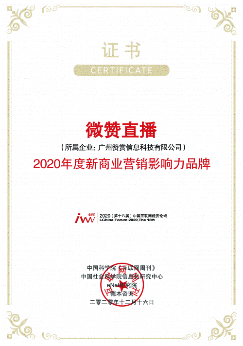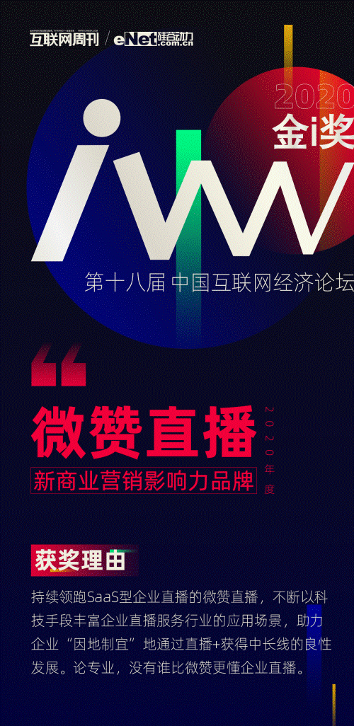 会上,2020年度金i奖正式发布,微赞直播作为国内影响力企业直播营销服务品牌,凭借行业领先的直播营销服务和运营能力,荣获2020年度新商业营销影响力品牌奖。