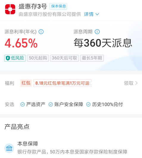 最关键的是高利息,拿盛京银行之前推的盛惠存 3 号为例,年化利率达到了 4.65% 。