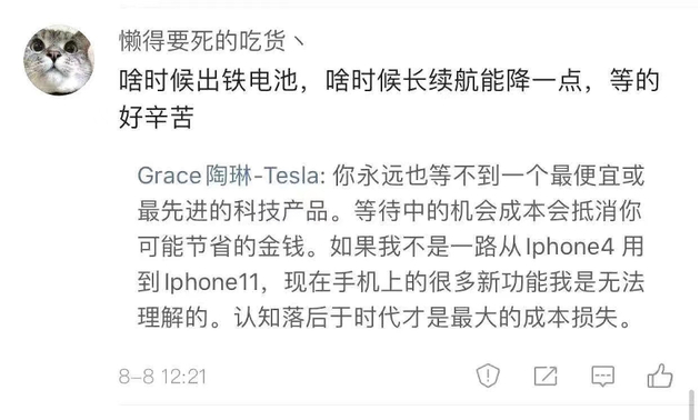 8月8日的时候,陶琳在自己的微博回复一位网友提问的时候,表态“你永远也等不到一个最便宜或最先进的科技产品。等待中的机会成本会抵消你可能节省的金钱。如果我不是一路从iPhone4(应为iPhone)用到iPhone11,现在手机上的很多新功能我是无法理解的。认知落后于时代才是最大的成本损失。”