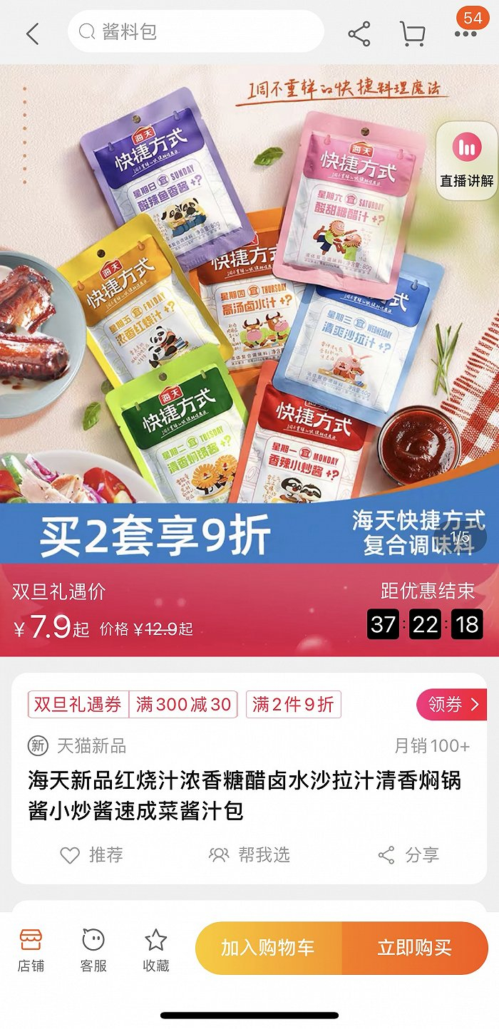 近日,海天味业在其天猫旗舰店上线了一系列“快捷方式”中式复合调味料,分别是包括香辣小炒酱、清香焖锅酱、清爽沙拉汁、高汤卤水汁、浓香红烧汁、酸甜糖醋汁、酸辣鱼香酱在内的7款产品,均采用小包装,规格分50g、60g、80g三种,目前销售单价为7.9元,7包组合售价25.9元。