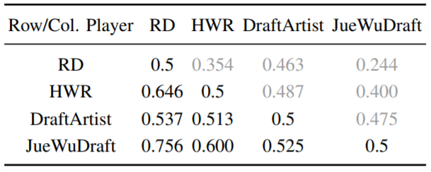 表 1:在 AI 数据集的单局比赛中(各行玩家对抗各列玩家),每一对策略中各行玩家的预测胜率。