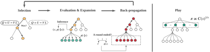 搭配深度神经网络的并行 MCTS:该框架使用的搜索算法是多项式置信度上限树。为了提升数据采用的速度和充分利用计算资源,对树的搜索是并行执行的。总体而言,PUCT 搜索树是按四个步骤迭代式构建的:选择、评估、扩展和反向传播。图 3 展示了该过程。