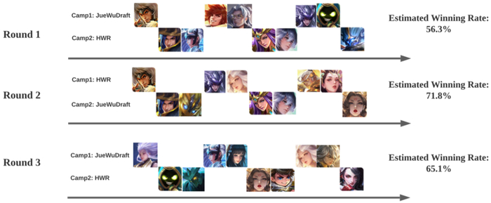 图 10:JueWuDraft 对抗 HWR 的一次具体模拟结果,其中 JueWuDraft 先手选择。