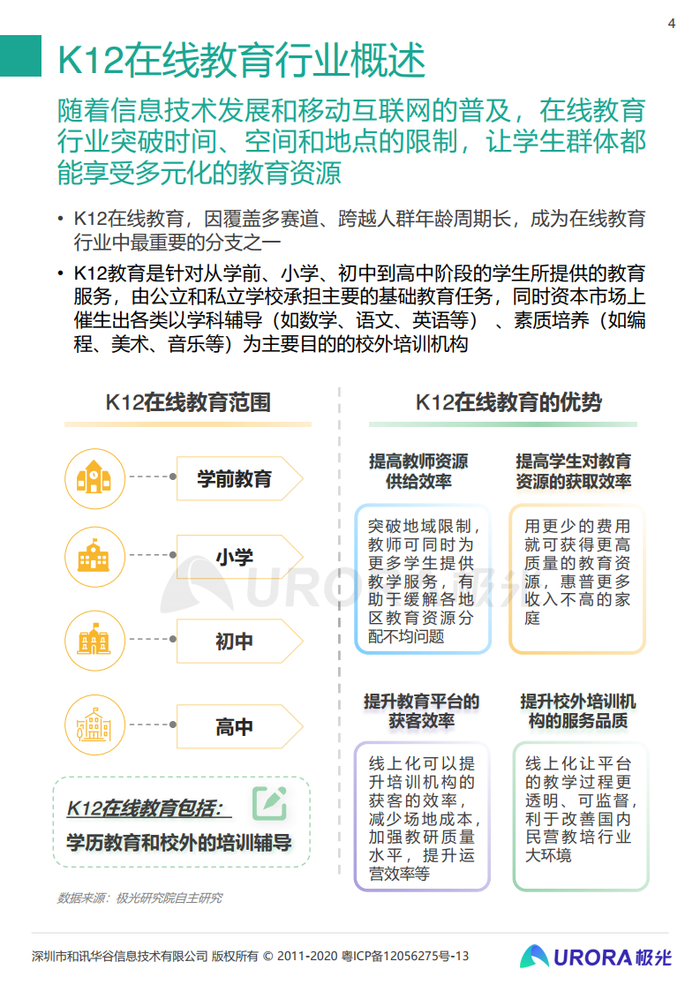 随着信息技术发展和移动互联网的普及,在线教育行业突破时间、空间和地点的限制,让学生群体都能享受多元化的教育资源。K12在线教育,因覆盖多赛道、跨越人群年龄周期长,成为在线教育行业中最重要的分支之一。K12教育是针对从学前、小学、初中到高中阶段的学生所提供的教育服务,由公立和私立学校承担主要的基础教育任务,同时资本市场上催生出各类以学科辅导(如数学、语文、英语等) 、素质培养(如编程、美术、音乐等)为主要目的的校外培训机构。