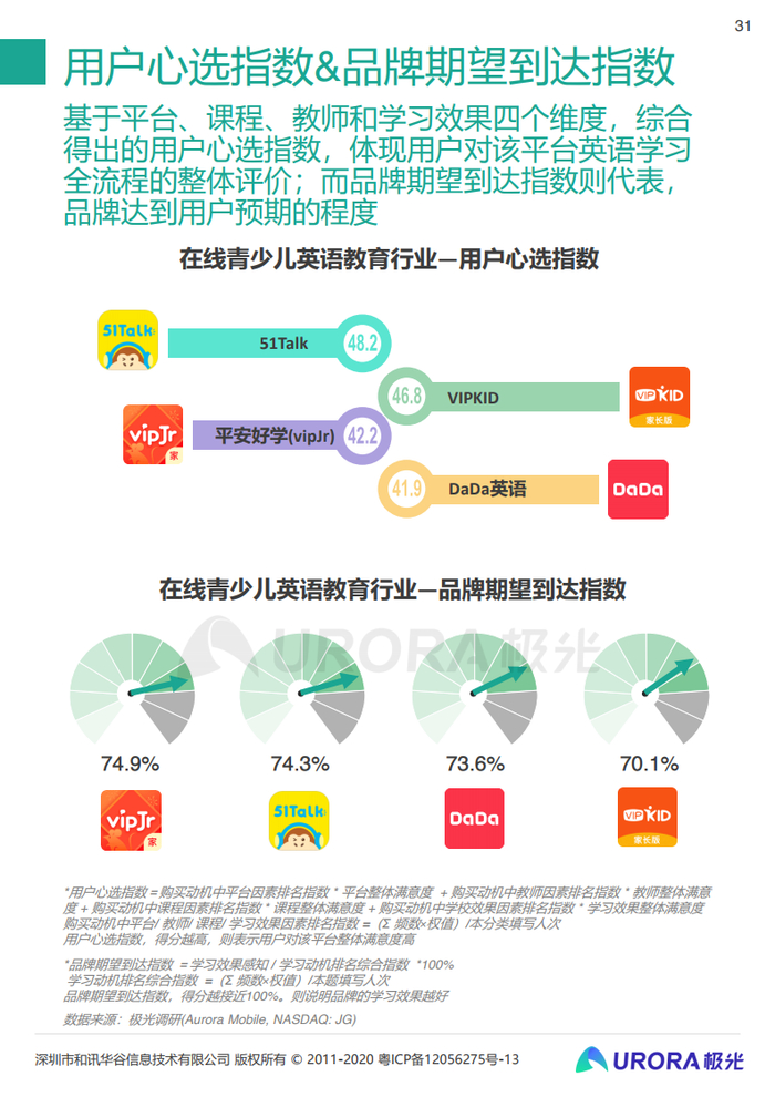 基于平台、课程、教师和学习效果四个维度,综合得出的用户心选指数,体现用户对该平台英语学习全流程的整体评价;而品牌期望到达指数则代表,品牌达到用户预期的程度。
