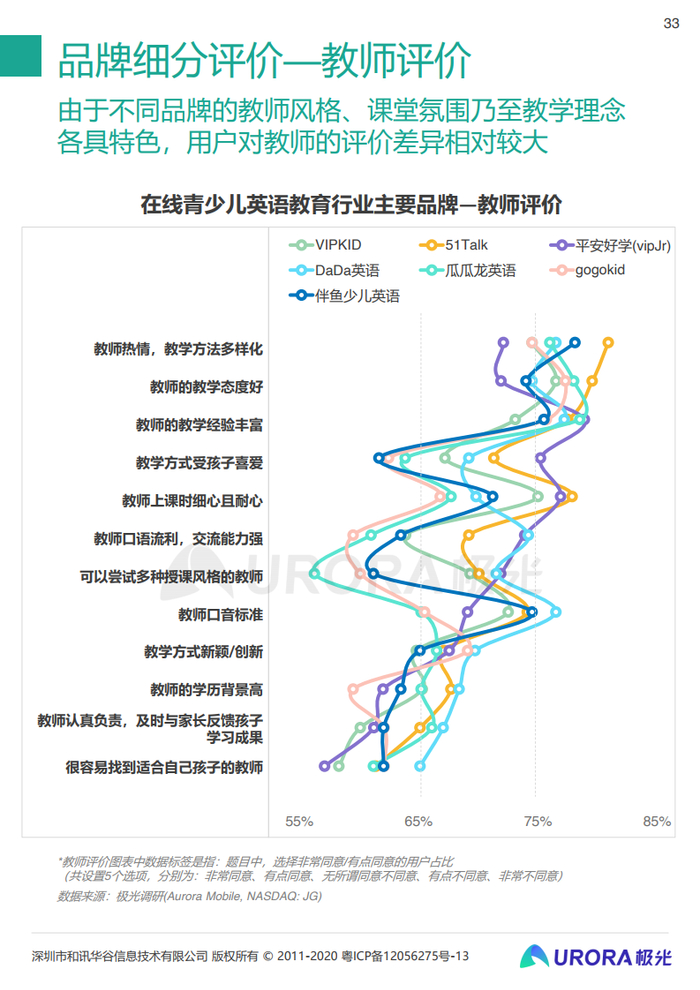 由于不同品牌的教师风格、课堂氛围乃至教学理念各具特色,用户对教师的评价差异相对较大,其中51Talk在教师热情,教学方法多样化的方面评价最高。