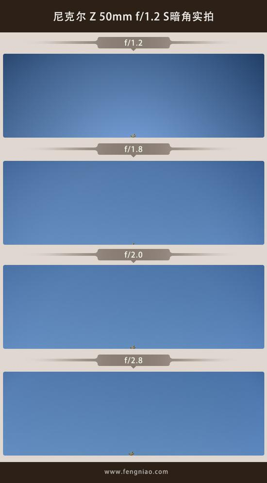 对于超大光圈的镜头来说,暗角的表现一直是很多人所关心的,此次我针对尼克尔 Z 50mm f/1.2 S也进行了暗角实拍,机内设置是将暗角控制改为正常,并未完全关闭、光圈优先、逐级调整光圈。