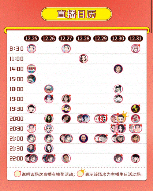 12月25日-12月31日,“陪你听到2021”跨年直播火热进行中。每天直播时间从8:30到22:00,用户登录喜马拉雅App,就可以享受从清晨到睡前的陪伴。超50名主播,参加跨年直播,包括华风五、伍壹先生、未来欧巴、讲故事的周默、云天河、暮玖、润为有声_九星、十一甜、寐尹、清月古筝、播音青雀、米琪小连杀、佳期、郭益达、青山等。直播形式和主题包括新书分享、抽奖直播、爆更直播、剧组答谢&主创吐槽会、杀青直播、剧组联欢跨年会、作者访谈等。