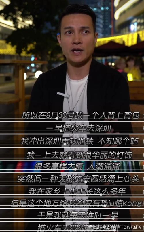 而更重要的是,当时站在深圳的土地上,看着广场上人潮涌涌,老人孩子们都在悠然嬉笑,他突然感到了一股无形的安全感,感叹自己在香港土生土长,可家乡带来的却只有恐惧和惊慌。