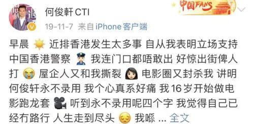 2019年11月时,他曾发微博讲述自己撑警后的遭遇:不敢出门怕被人打、被家人割席、被电影圈封杀……