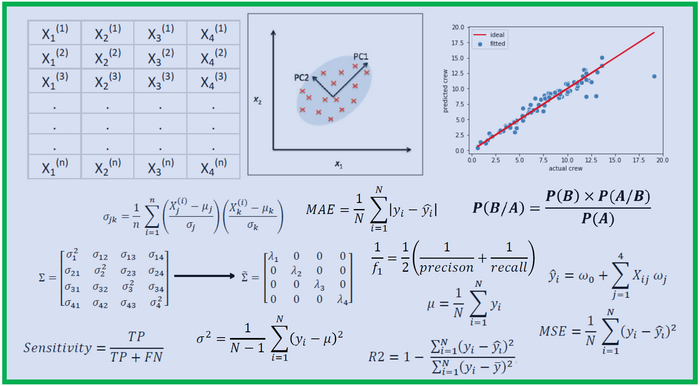这里是你需要熟悉的概念:均值,中位数,众数,标准差/方差, 相关系数和协方差矩阵,概率分布(二项,泊松,正太), p-值, 贝叶斯理论(精确性,召回率,阳性预测值,阴性预测值,混淆矩阵,ROC曲线), 中心极限定理, R_2值, 均方误差(MSE),A/B测试,蒙特卡洛模拟。