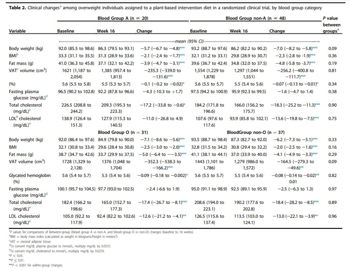 考虑到血型和饮食之间的潜在联系,研究人员采取了额外的步骤,在16周随机临床试验的干预组参与者中进行了二次分析。他们分析了基于植物的饮食干预对体重、血脂和血糖控制的影响是否与ABO血型相关,结果发现并无区别。