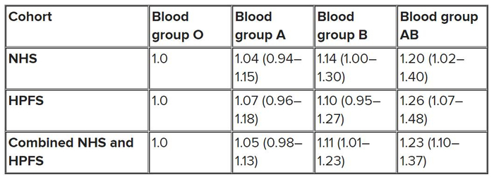较早的研究表明,A型血与高水平的LDL(“坏”)胆固醇有关,而AB型血与炎症相关,这些都是心脏病的危险因素。2012年,来自哈佛大学公共卫生学院的研究人员汇总了两项长期研究数据,在20年内追踪了89500名成年人,结果发现,与O型血的人相比: